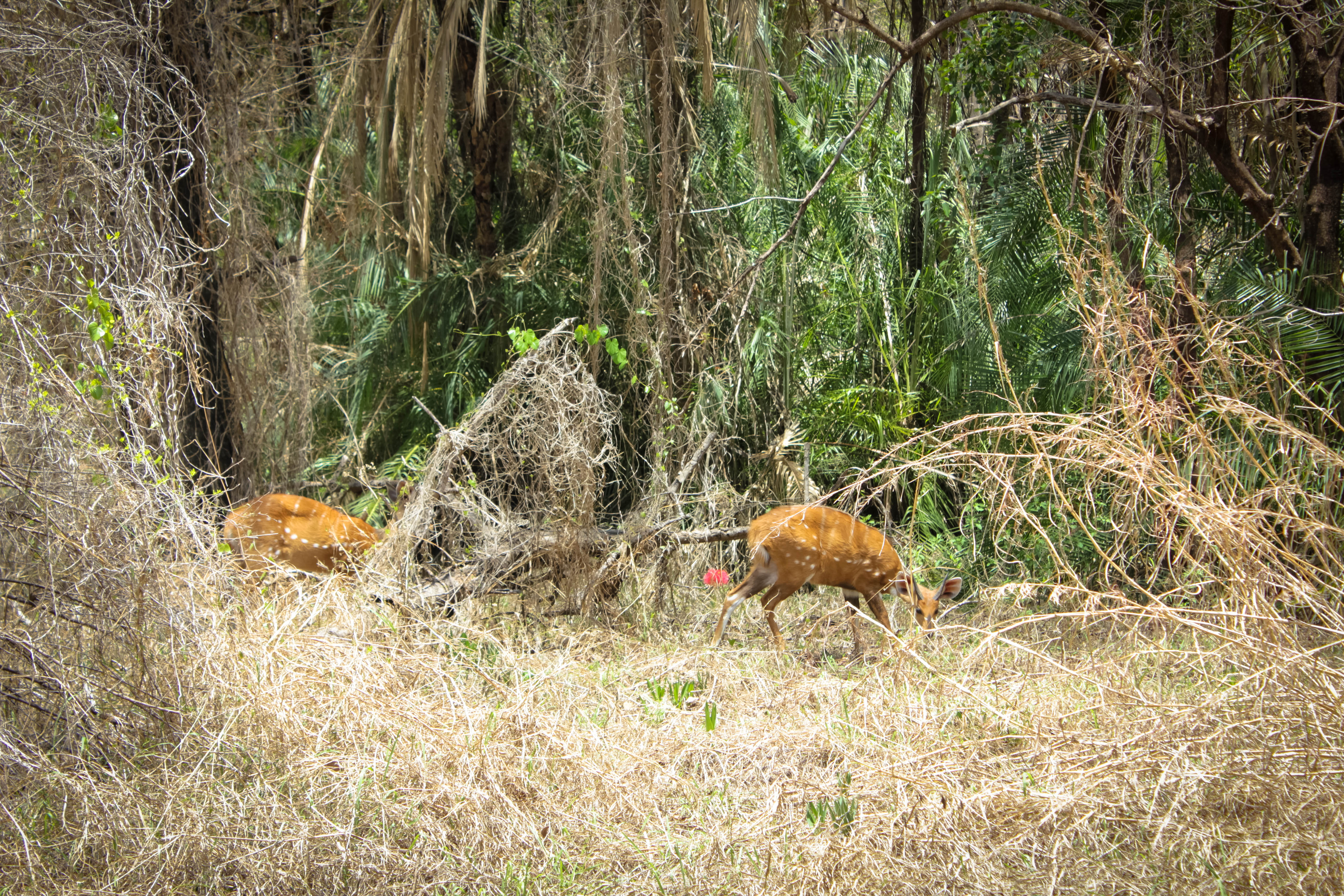 Từ điểm thứ Ba đến thứ Sáu của cung đường, chúng tôi băng qua khu rừng nhiệt đới không bao giờ ngừng khóc (rainforest) của vườn quốc gia Victoria Falls. Tôi gọi nó là khu rừng không bao giờ ngừng khóc vì mưa rơi ở đây chẳng bao giờ tạnh. Những cơn mưa phùn nhẹ mùa hạ và những con mưa lớn hơn vào mùa mưa nuôi sống những loài thực vật khổng lồ không rễ. Những cái cây hình thù kỳ dị mọc lung tung ngang dọc bên lưng chừng thác, hay nghiêng ngả trên đất liền vì không có rễ bám vẫn sừng sững và to lớn vì được uống nước quanh năm. Mẹ Thiên Nhiên luôn có cách của bà! Tôi thích đi trong khu rừng này lắm, đến độ chẳng muốn thoát ra. Một phần vì lạc lối trong một khu rừng thần tiên nhường ấy mát rười rượi; tôi đồ chẳng có một chiếc quạt gió hay máy lạnh nào trên thế giới tuyệt vời hơn thế. Một phần vì thần rừng bày sẵn những chiếc xích đu bện bằng cành cây đong đưa hiếu khách mời ai đó đã mỏi – những chiếc xích đu tưởng chỉ có trong film ảnh. Smart đã nói với tôi như vậy: “trông gương mặt của bạn vui vẻ làm sao!”. Ừ thì đó chính là khoảnh khắc mà tôi đã thực sự tận hưởng đấy, Smart ạ. Những đoá hoá cầu lửa (fireball flowers) mọc dại bên đường. Những con gà sao “đội mũ bảo hiểm” (***) nhơn nhởn khắp khu rừng mưa. Chim muông ca hát ríu ra ríu rít. Hệ thực vật đa dạng rậm rạp. Và rồi hai con linh dương châu Phi ăn cỏ hiền hoà nhảy chân sáo thoăn thoắt lánh người. Những con linh dương thân mình nâu, đốm trắng, tai ngắn chính là Bambi bước ra từ câu chuyện của Disney. Ở đây, tất cả những điều cổ tích nhất đều có thật.