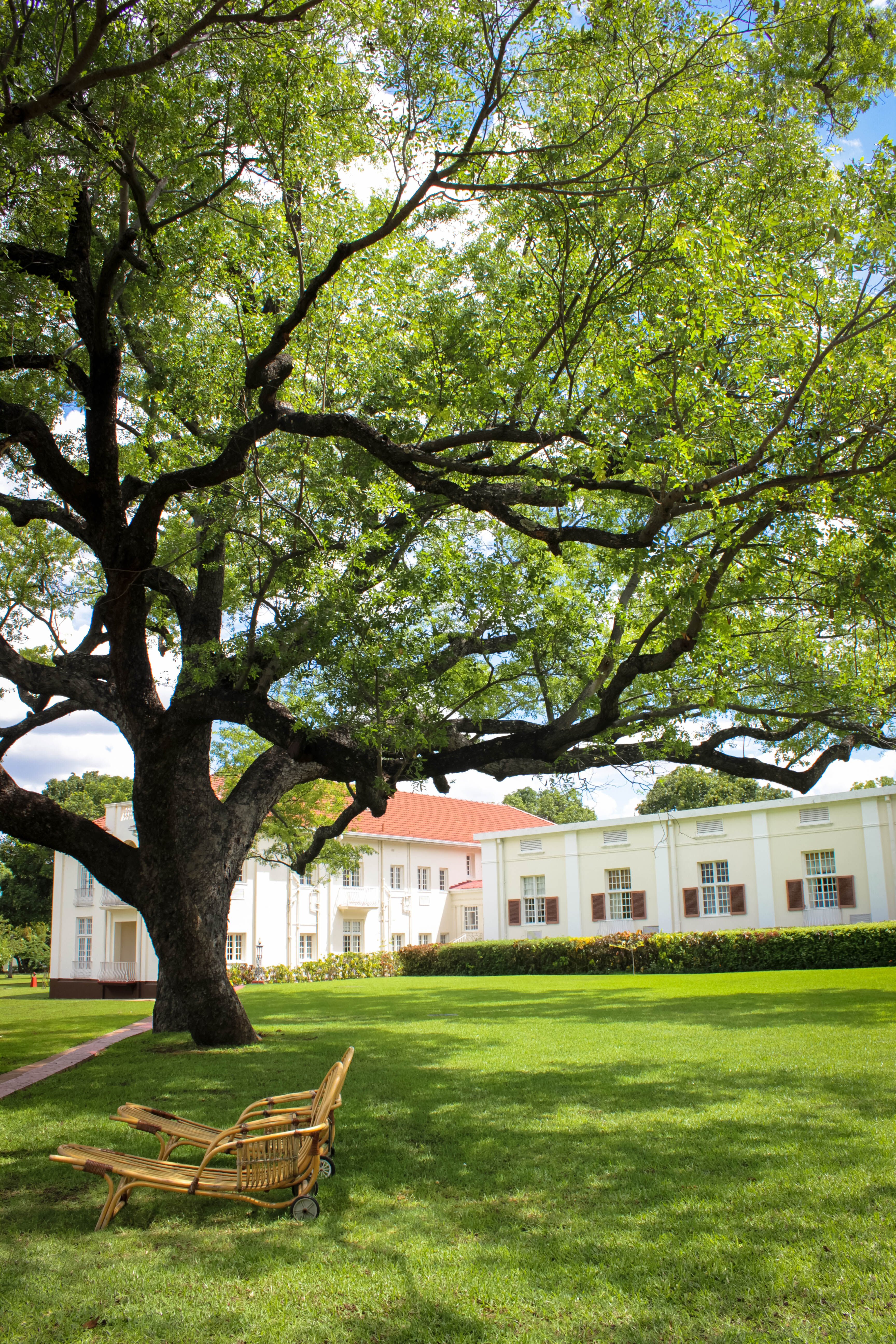 Điểm đặc biệt nhất về khách sạn Victoria Falls – như bao khách sạn đắt tiền khác – chính là tầm nhìn. Từ khuôn viên xanh ngắt của khách sạn chính là trực diện cầu Victoria Falls. Khách sạn còn tình cờ một cách tinh ý khi để hai cái ghế bằng mây dưới tán cây rợp bóng.