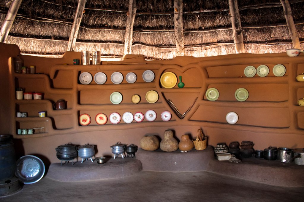 Nhà tù trưởng giàu có nhất làng, là nơi sinh sống của tứ đại đồng đường. Ông mời mọi người vào thăm cả chốn riêng tư nhất là phòng ngủ hai gian của ông. Ông có chiếc TV cũ rích trắng đen như của ông bà tôi ngày trước, có cả radio chẳng còn hoạt động, chiếc tủ lạnh cỡ trung, giường chiếu được gấp thẳng thóm và mọi thứ khác tuy cũ kỹ nhưng tinh tươm. Ở đây chẳng có sóng điện thoại, càng không có sóng vô tuyến… Những căn nhà đất nung lợp cỏ khô châu Phi rải rác trong khuôn viên vườn, cách nhau vài bước chân dành cho từng cá nhân hay gia đình nhỏ riêng biệt. Cỏ châu Phi dày và chắc hơn cỏ Đông ta nhiều lần, đủ để tránh cái nắng cháy da cháy thịt của lục địa đen. Những căn nhà đáng yêu, mộc mạc và cực kỳ ngăn nắp. Tôi chưa bao giờ gặp căn bếp nào gọn ghẽ đến vậy trong cuộc đời mình, kể cả những căn bếp sang trọng trên tạp chí kiến trúc có khi cũng không sánh bằng. Những bầu rượu nặn bằng đất nung, những chiếc nồi nhôm ba chân, hay chén, đĩa nặn tròn trĩnh bằng đất sét xinh như đồ hàng của mấy bé gái được đặt ngăn nắp. Tôi hỏi Josia, liệu căn bếp có được sắp xếp trước vì họ biết hôm nay chúng tôi đến thăm? Và Josia bảo tôi rằng, những con người ở đây luôn là chính họ, họ chẳng bao giờ sắp xếp trước điều gì, có chăng đôi khi chỉ là một bộ quần áo tươm tất hơn. Đàn bà chỉ được ăn cùng nhau dưới gian bếp nhỏ, sau khi đã phục vụ cơm canh nóng hổi cho cánh đàn ông ở gian nhà trên.
