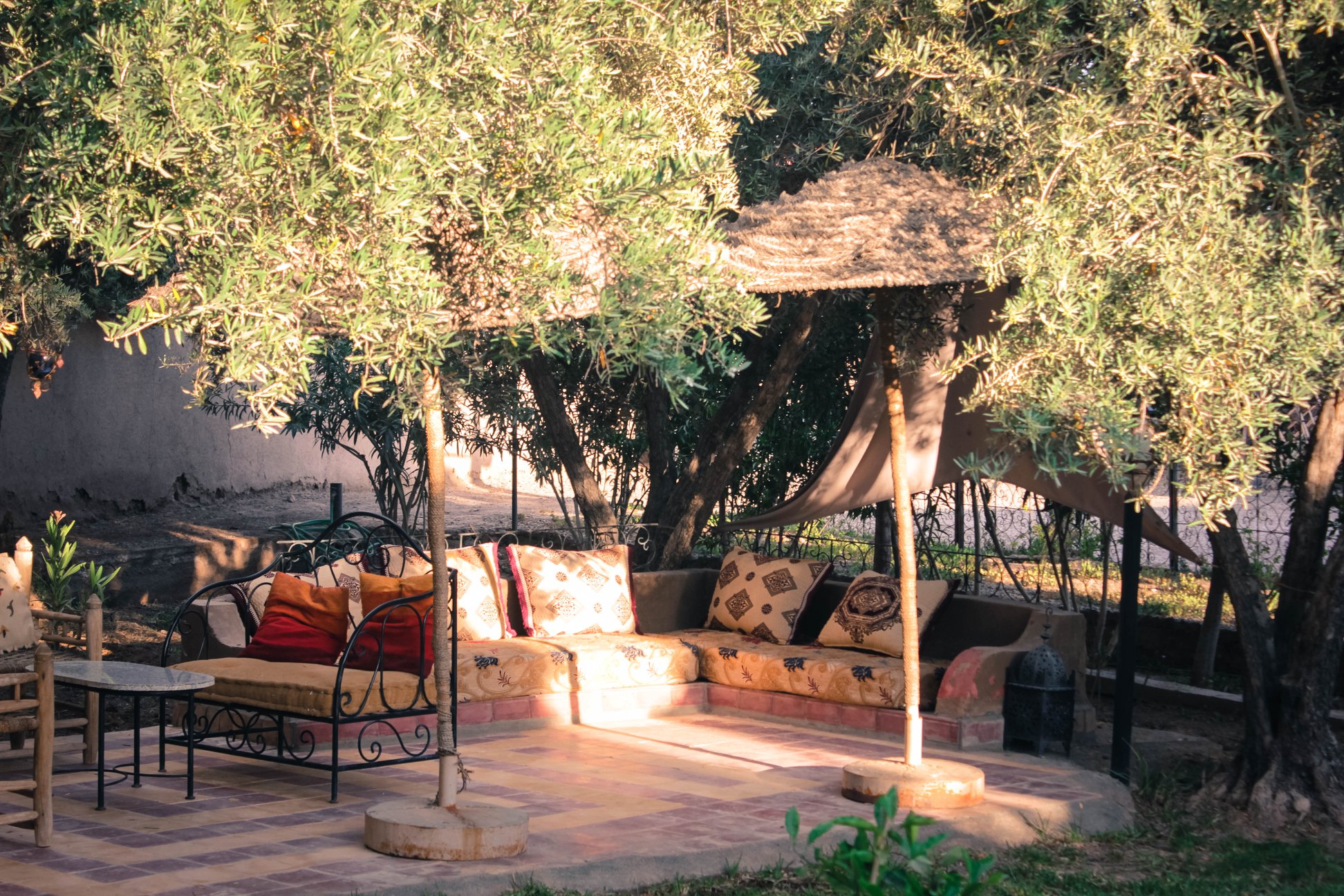 Chez Laila là một nơi dừng chân lý tưởng, là một biệt thự vùng quê đúng nghĩa. Ánh nắng chiều nơi đây không gắt gỏng miền hoang mạc mà nhẹ nhàng, bình dị. Chúng len lỏi qua từng khung cửa sổ được đóng với gout rất riêng, hắt lên bức tường đỏ bức tranh tĩnh vật đồng quê ấm áp. Sáng sáng chúng tôi được đánh thức bởi tiếng chim ríu rít đã được Mẹ Thiên Nhiên chọn lọc kỹ càng. Tuyệt nhiên chẳng có bất cứ âm thanh xô bồ nào khác chen ngang. Chez Laila có khu vườn đáng yêu với những bông hồng khổng lồ và cây cầu gỗ dẫn vào hiên nhà rải sỏi hai bên. Trong vườn bày biện năm, bảy bộ bàn ghế đủ sức chứa cho khách gia đình như đoàn chúng tôi. Trong vườn có những mái lều dựng cho khách ngồi thưởng chút trà chiều, hút vài ba điếu cigar đắt đỏ, trông dung dị nhưng lại kiêu kỳ chẳng kém Sex & the city II (1). Trong vườn có một hồ bơi nhỏ làm dịu mát bầu trời bỏng rát mùa hè Bắc Phi. Chez Laila còn có một phòng ăn ấm cúng trong nhà phục vụ bữa sáng đủ chất và món yoghurt chua chua ngọt ngọt khó quên. Chez Laila hiếu khách và dễ mến đến độ dành tặng một phòng cho tài xế của chúng tôi – Hassan, chứ chẳng hề trịch thượng như những riad (2) mà chúng tôi đã từng lưu lại.