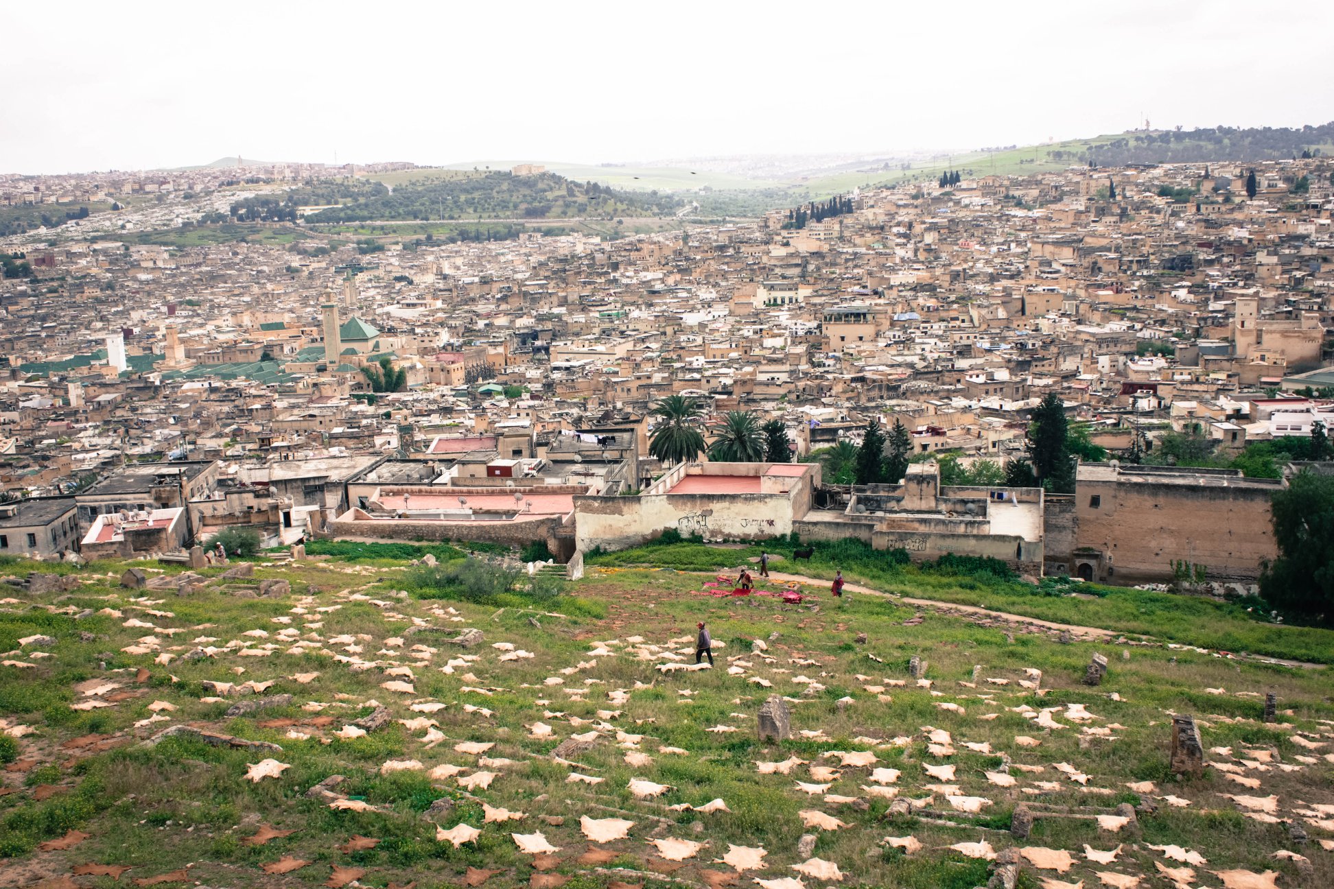 Và tôi đã yêu mến Fez khi đứng trên tường thành cheo leo nhìn xuống một mê cung cổ hỗn độn. Đó là một trong những hình ảnh rộng lớn khác của châu Phi mà chẳng quốc gia nào của châu Phi sánh được. Đó là một trong những hình ảnh rộng lớn khác của châu Phi mà tôi chưa bao giờ được biết đến trước đó. Cái sự lộn xộn đẹp đẽ đó thôi thúc tôi quên đi nỗi sợ độ cao mà trèo mãi, trèo mãi đến điểm cao nhất của tường thành lộng gió. Bên trái là những bãi cỏ xanh rì, là những ngôi mộ của Muhammad lí nhí trắng tinh, là những thảo nguyên phủ đầy cây xanh dưới bầu trời cao. Bên phải là tất cả thành cổ Fez đã ở đó từ hơn thiên niên kỷ, chi chít những căn nhà sát vách mái đỏ, mái xanh, mái vàng. Bên dưới là hàng trăm tấm da dê thô có, nhuôm xanh đỏ có xộc lên một mùi đặc trưng khó chịu nhưng nghiện ngập, có chú bé chăn lừa đang vuốt ve trìu mến người bạn bốn chân của mình, có người đàn ông già đang giũ mạnh những miếng da vừa nhuộm bên kia đồi. Một tấm da dê ở đây chỉ có giá 300,000 đồng chưa trả giá.